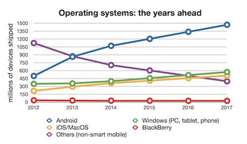 O Gartner prevê que até 2017, as vendas do Android vão superar (e em muito) qualquer outro sistema operativo no mercado, sendo que já em 2014 vamos ver o Android em mais de mil milhões de equipamentos. A BlackBerry vai continuar a deslizar nas vendas globais e vai acabar muito atrás do Windows Phone, e em 2015 os tablets vão vender mais que os PCs mais tradicionais, como notebooks e desktops. “Vencer no mercado de Tablets e Smartphones é fundamental para a Microsoft permanecer relevante nesta mudança tecnológica”, diz Milanesi.